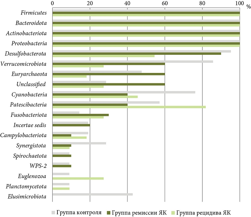 Основными доминирующими филумами в образцах пациентов с ЯК и в контрольной группе были представители четырех типов: Firmicutes, Bacteroidota, Proteobacteria и Actinobacteriota. Данные микроорганизмы являются типичными и основными представителями нормофлоры, занимая нишу в 98–99% от всего микробного сообщества толстой кишки. Различия в структуре флоры на уровне типа характеризовались повышением уровня филума Actinobacteriota и снижением уровня Verrucomicrobia у пациентов с ЯК как в стадии обострения, так и в стадии ремиссии заболевания при сравнении с группой контроля.
