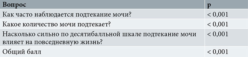 Кроме того, положительная динамика отмечалась в аспекте подтекания мочи (табл. 2). Так, ответ «никогда» значимо чаще встречался после операции, а все другие ответы – реже.