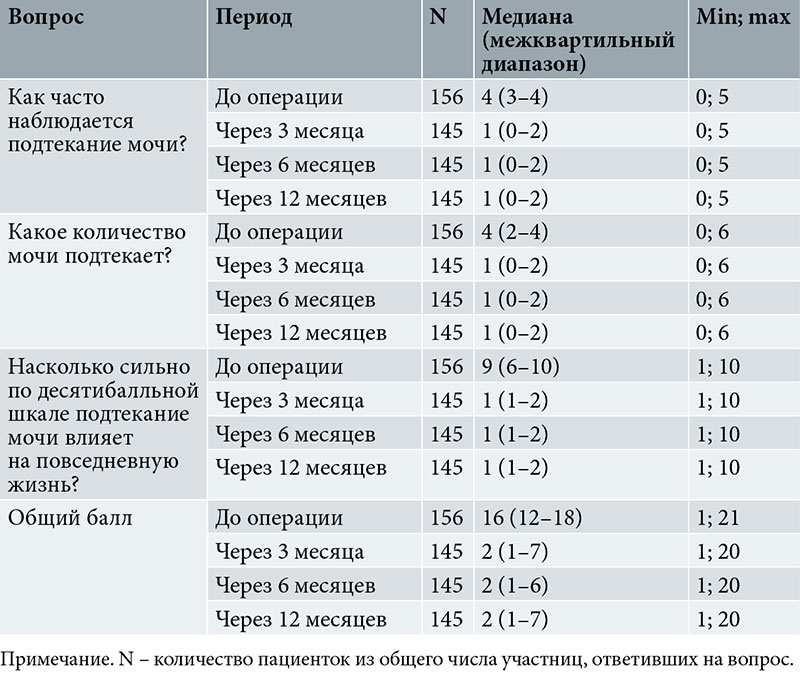 Для оценки нормальности распределения использовали критерий Шапиро – Уилка. Нормально распределенные данные описывали с помощью среднего значения и стандартного отклонения. Данные, не подчиняющиеся закону нормального распределения, описывали с помощью медианы, минимального и максимального значений, межквартильного диапазона. Для сравнения показателей опросника ICIQ-SF результаты попарно сравнивали до операции и через три, шесть, 12 месяцев после нее соответственно с использованием критерия Вилкоксона. Статистическую обработку данных проводили с помощью статистических пакетов IBM SPSS 26.0 (IBM, США), Jamovi 1.8.3, а также пакета Excel (код продукта: 00334-38920-77957-AA497).