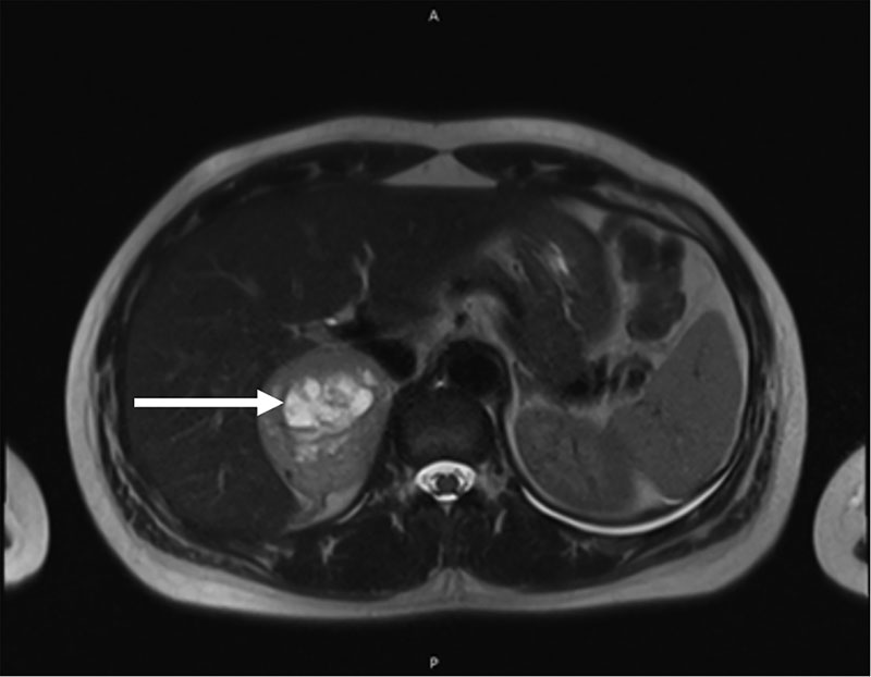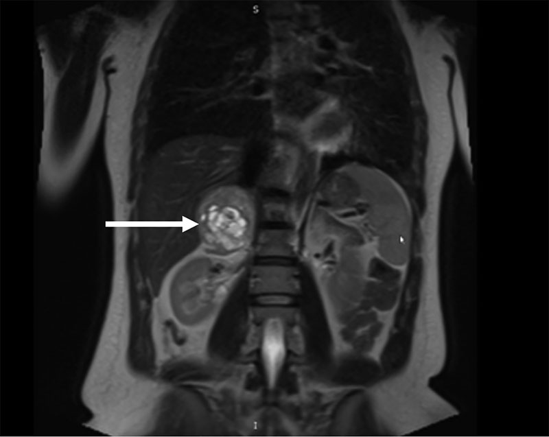 По данным магнитно-резонансной томографии (МРТ) ОБП и забрюшинного пространства от 10.12.2024 г.: правая почка оттеснена книзу неоднородным отграниченным образованием, локализованным вдоль внутренней ножки правого надпочечника, округлой формы, размерами 5,8 × 6,2 × 5,3 см; в центре жидкостный компонент, окруженный по контуру стромой с диффузным типом накопления контрастного препарата; левый надпочечник Y-образной формы, толщина ножек до 5 мм, без дополнительных образований.