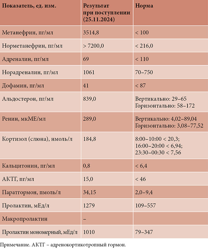 Анамнез заболевания. В течение 2024 г. отмечала приступы повышения АД до 210–240/110–120 мм рт. ст. Постоянную гипотензивную терапию не получала, эпизодически принимала каптоприл. С конца октября 2024 г. гипертонические кризы участились и стали более длительными и интенсивными. Вечером 24.11.2024 г. внезапно повысилось АД до 170/100 мм рт. ст., появились многократная рвота, кашель, давящая боль за грудиной с иррадиацией в челюсть. Прием каптоприла эффекта не дал. В дальнейшем нарастали тахикардия до 146 уд/мин и одышка с частотой дыхательных движений до 30 в минуту, сатурация крови (SpO2) снизилась до 90%, при аускультации в легких выслушивались влажные хрипы. Врач скорой медицинской помощи провел терапию изосорбида динитратом и фуросемидом без выраженного эффекта, пациентка была доставлена в стационар городской клинической больницы скорой медицинской помощи № 2, по экстренным показаниям госпитализирована в отделение реанимации. Состояние расценено как гипертонический криз с начинающимся отеком легких. В анализах крови при поступлении наблюдались лейкоцитоз, тромбоцитоз, уровень гемоглобина (Нв) – 164 г/л, повышение уровней креатинина, глюкозы, аспартатаминотрансферазы (АСТ), аланинаминотрансферазы (АЛТ), тропонина, метанефрина, норметанефрина, норадреналина, кортизола слюны, остальные показатели были в пределах референсных значений или незначительно изменены (табл. 1, 2). В общем анализе мочи изменений не было.