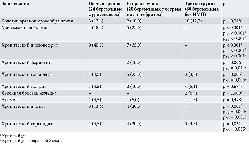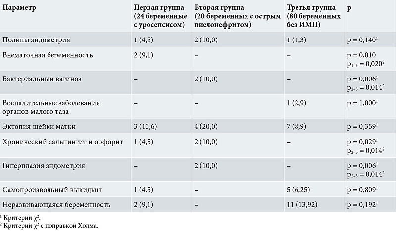При анализе экстрагенитальной заболеваемости (табл. 1) выявлены статистически значимые различия между группами по некоторым нозологиям. Так, мочекаменная болезнь диагностирована у каждой пятой (18,2%) пациентки первой группы и каждой четвертой (25%) – второй группы. У пациенток третьей группы заболевание не выявлено (p < 0,001). Хронический пиелонефрит встречался почти у каждой второй (40,9%) пациентки первой группы и каждой третьей (35,0%) – второй группы. У женщин третьей группы данное заболевание отсутствовало (p < 0,001). Хронический цистит диагностирован у каждой седьмой (13,6%) беременной первой группы, у каждой пятой (20,0%) – второй группы. В третьей группе хронический цистит не встречался (p = 0,002 и p < 0,001 соответственно).