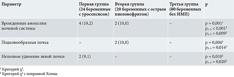 Врожденные аномалии мочевой системы (табл. 2) диагностированы у каждой пятой (18,2%) пациентки первой группы и каждой десятой (10,0%) – второй группы, тогда как в третьей группе подобные отклонения отсутствовали (p < 0,001 и p = 0,009 соответственно). Из особенностей анатомического строения мочевой системы у беременных первой группы зафиксировано неполное удвоение левой почки (9,1%), которое не наблюдалось у женщин других групп (p = 0,010). Подковообразная почка выявлена у каждой десятой (10,0%) пациентки второй группы. В первой и третьей группах данная особенность развития мочевой системы не зарегистрирована (p = 0,006).