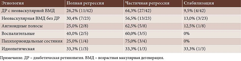 Полная регрессия очага (отсутствие признаков неоваскуляризации по данным ОКТ-А и ФАГ) достигнута у 24 (28,2%) пациентов, частичная регрессия (уменьшение размеров очага > 50% или значительное снижение активности) – у 52 (61,2%), стабилизация (отсутствие значимой динамики) – у 9 (10,6%). Прогрессирования неоваскуляризации на фоне лечения не зафиксировано (табл. 3).