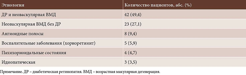 Развитие неоваскулярной глаукомы у 7,1% пациентов, преимущественно с диабетической ретинопатией, указывает на необходимость тщательного мониторинга уровня внутриглазного давления и своевременного проведения лазерной коагуляции у пациентов данной группы.