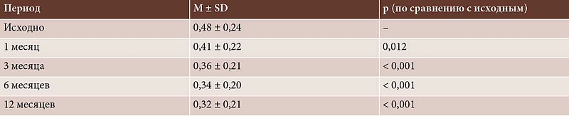 Исходная острота зрения составила 0,48 ± 0,24 logMAR (что соответствует 0,33 по таблице Снеллена), через месяц после начала лечения – 0,41 ± 0,22 logMAR (p = 0,012), через три месяца – 0,36 ± 0,21 (p < 0,001), через шесть месяцев – 0,34 ± 0,20 (p < 0,001), через 12 месяцев – 0,32 ± 0,21 logMAR (p < 0,001) (табл. 2).