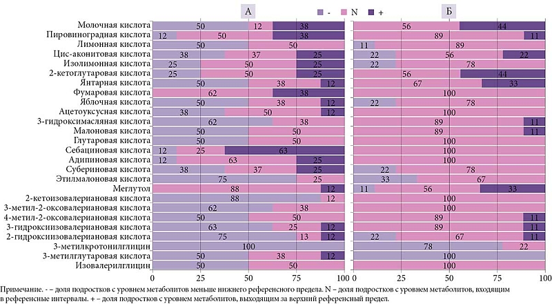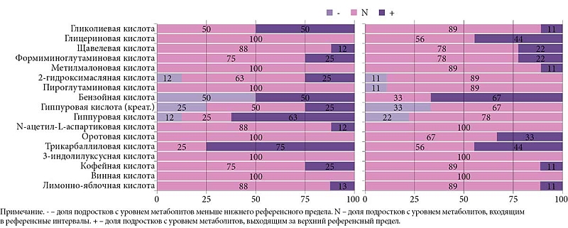 Лабораторное обследование заключалось в определении уровня органических кислот (60 метаболитов) в моче подростков с использованием высокочувствительного аналитического метода газовой хроматографии с масс-спектрометрической детекцией (лаборатория «Хромолаб»). Органические кислоты – соединения, образующиеся в результате многочисленных обменных реакций и являющиеся промежуточными продуктами распада белков, жиров, углеводов, витаминов и других соединений. Исследование на органические кислоты дает комплексное представление о воспалительном и метаболическом статусе и позволяет оценить выработку клеточной энергии, детоксикацию, обмен нейромедиаторов, выявить дефицит витаминов и антиоксидантов, окислительный стресс, избыточный рост ряда кишечных микроорганизмов, то есть многих процессов, связанных с развитием как соматической, так и психической патологии.