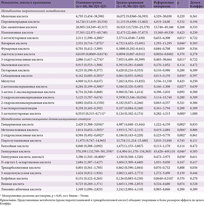 В таблице представлены результаты анализа мочи на органические кислоты, достоверно отличающиеся в обследуемых группах как по тесту Манна – Уитни, так и по размеру эффекта различия (дельта Клиффа).