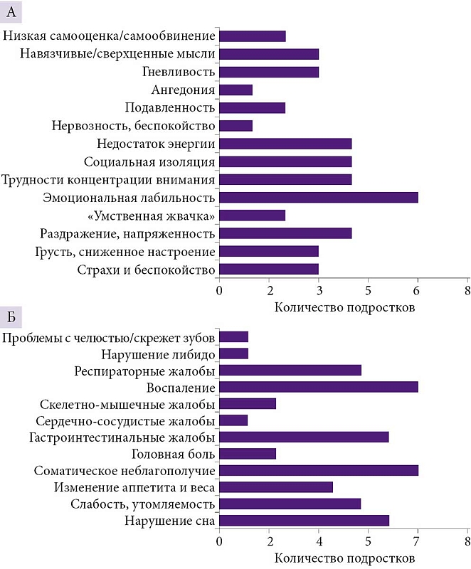 Среди психопатологических симптомов чаще всего встречалась эмоциональная лабильность (60%), которая проявлялась более длительными и яркими эмоциональными реакциями в ответ на внешние провоцирующие факторы, а также аутохтонно возникающие колебания настроения в течение дня. С равной частотой (по 40%) фиксировались недостаток энергии, социальная изоляция и трудности концентрации внимания. Подростки отмечали повышенную утомляемость в течение дня, жаловались на усталость и недостаток энергии, отказывались от посещения кружков и секций, в которые ранее с удовольствием ходили после школы. Отмечалась социальная изоляция с отказами проводить время в компании друзей и родственников. Возникали трудности с концентрацией внимания при выполнении учебных задач, что сопровождалось отвлекаемостью, невозможностью сосредоточиться на одном деле. В ответ на уговоры и требования со стороны родителей подростки демонстрировали реакции раздражения с элементами вербальной и/или физической агрессии.