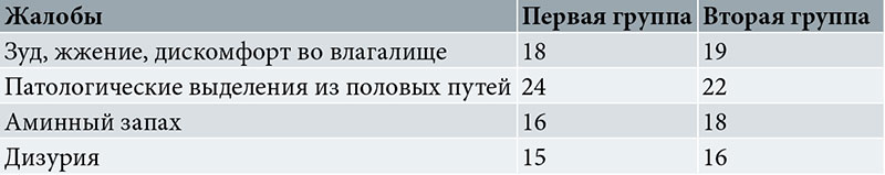 Основными критериями включения пациенток в исследование были наличие жалоб и лабораторно подтвержденный диагноз БВ во время беременности. БВ диагностировали на основании жалоб и критериев Амселя. В таблице представлены основные жалобы пациенток до начала лечения: зуд, жжение, дискомфорт во влагалище, патологические выделения из половых путей, аминный запах, дизурия.