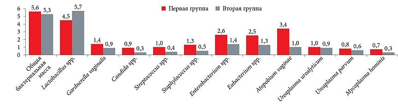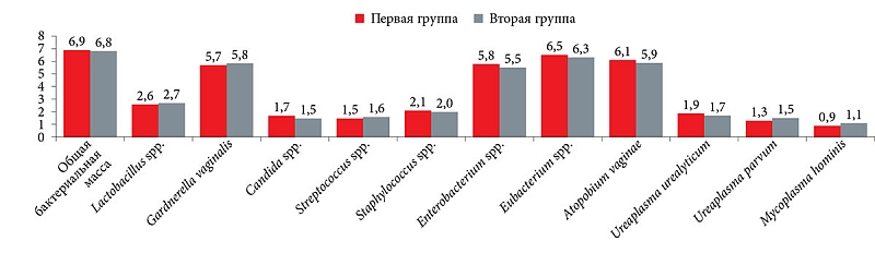Микробиоценоз влагалища определяли с помощью ПЦР-диагностики методом «Фемофлор». На рисунке 1 представлены результаты микробиоценоза в обеих группах до начала лечения.