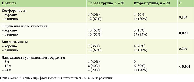 Анализ показателей опросников по комфортности, удобству применения, а также органолептическим свойствам средств Липобейз® показал следующие результаты: комфортность использования в первой группе 60% пациентов оценили как отлично и 40% – как хорошо, во второй группе: 80% – отлично и 20% – хорошо. Показатель «ощущение после нанесения» 50% пациентов первой группы оценили как отлично и 50% – как хорошо, во второй группе: 85% – отлично и 15% – хорошо. Длительность увлажняющего эффекта в первой группе была оценена следующим образом: восемь часов – 40% пациентов, 12 часов – 40% пациентов, 24 часа – 20% пациентов. Длительность увлажняющего эффекта во второй группе была оценена следующим образом: 12 часов – 30% пациентов, 24 часа – 70% пациентов. Статистически значимая разница между группами отмечалась по всем показателям (табл. 2). При этом комплексное применение средств Липобейз® крем и Липобейз® масло для ванны и душа по оценке самих пациентов способствует достижению более высокого результата.