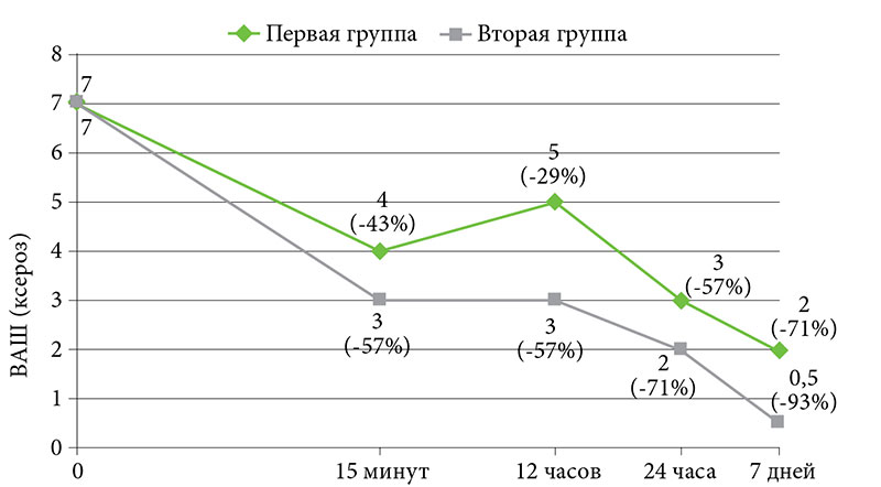 Изучение показателя ВАШ (ксероз) выявило снижение его значений по сравнению с показателем до применения средств Липобейз®. Положительная достоверно значимая динамика была отмечена в обеих группах, при этом отмечалась достоверно значимая разница при межгрупповом сравнении во всех контрольных точках. Анализ показателя ВАШ (ксероз) в контрольных точках выявил следующую динамику: через 15 минут после нанесения крема Липобейз® значение показателя ВАШ в первой группе снизилось на 43%, во второй – на 57%. В контрольной точке «12 часов» отмечалось снижение показателя на 29% в первой группе и на 57% – во второй. В контрольной точке «24 часа» показатель снизился на 57% в первой группе и на 71% – во второй. В контрольной точке «семь дней» показатель снизился на 71% в первой группе и на 93% – во второй (рис. 3).