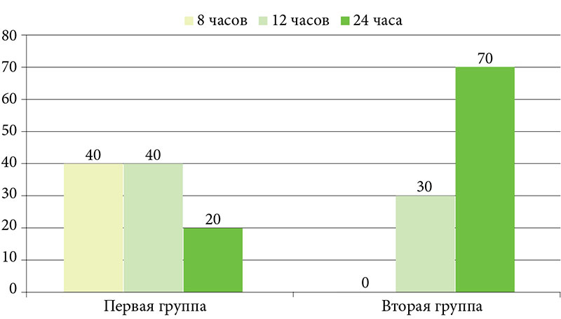 Одним из исследуемых показателей был показатель длительности увлажняющего эффекта по оценке самих пациентов, который определялся после семи дней применения средств Липобейз®. Анализ полученных данных показал следующее: в первой группе длительность увлажняющего эффекта 8 часов – 40% пациентов, 12 часов – 40% пациентов, 24 часа – 20% пациентов. Длительность увлажняющего эффекта во второй группе была оценена следующим образом: 12 часов – 30% пациентов, 24 часа – 70% пациентов (рис. 4).