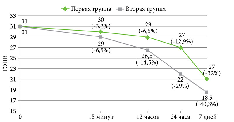 Значения показателя ТЭВА-метрии снижались в сравнении с нормой (за нормальный показатель было принято значение, полученное при измерении ТЭПВ в идентичной локализации у 10 практически здоровых людей – 16,4 ± 2,3 абс. ед.). Динамика показателя ТЭВА-метрии в контрольных точках была следующей: через 15 минут после нанесения крема Липобейз® значение ТЭПВ в первой группе снизилось на 3,2%, во второй – на 6,5%. В контрольной точке «12 часов» отмечалось снижение показателя на 6,5% в первой группе и на 14,5% во второй группе. В контрольной точке «24 часа» показатель снизился на 12,9% в первой группе и на 29% – во второй. В контрольной точке «семь дней» показатель снизился на 32% в первой группе и на 40,3% – во второй (рис. 2). Таким образом, положительная достоверно значимая динамика была отмечена в обеих группах, при этом отмечалась достоверно значимая разница при межгрупповом сравнении во всех контрольных точках.
