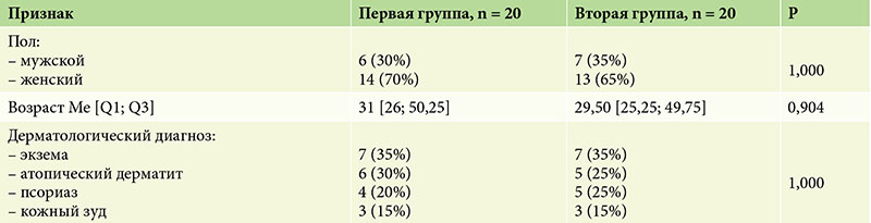 При анализе исходных клинико-анамнестических данных была показана сопоставимость групп по полу и возрасту (табл. 1). У всех пациентов отмечался ксероз на фоне дерматоза. Из дерматологической патологии у пациентов были диагностированы экзема, атопический дерматит, псориаз и кожный зуд, на момент включения в исследование отмечалась ремиссия основного кожного заболевания.