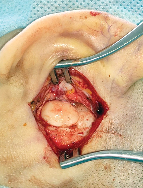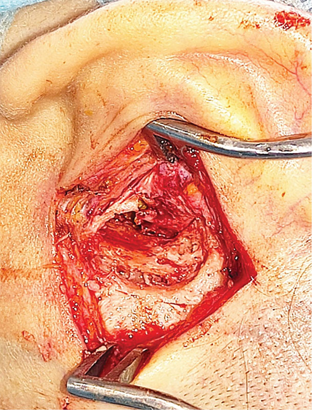 Хирургическое вмешательство под эндотрахеальным наркозом выполнено 06.03.2024 г. Под контролем операционного микроскопа произведен разрез мягких тканей заушной области слева, отступая около 2–3 мм от проекции опухоли. Тупо и остро новообразование выделено от мягких тканей. Новообразование костной плотности (рис. 3). Опухоль отделена от сосцевидного отростка бормашиной и долотами. Материал отправлен на гистологическое исследование. Костное ложе опухоли было обработано борами до здоровой костной ткани для предотвращения рецидива (рис. 4). Затем осмотрен наружный слуховой проход, который заполнен серными массами. После туалета уха электроотсосом отмечено, что прорастания новообразования в наружный слуховой проход нет. Барабанная перепонка серая, целая, контурирует. Разрез ушит рассасывающимся шовным материалом. Произведена тампонада комочками гемостатической губки. Повязка на заушную рану.