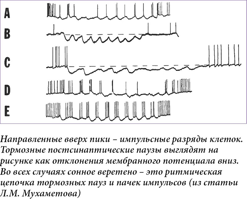 Действительно, ранние эксперименты на кошках Л.М. Мухаметова и Дж. Риццолатти убедительно показали, что режим «пачка – пауза», в который переходят нейроны таламокортикального комплекса в медленном сне, то есть «хоровое» чередование предельной длительной гиперполяризации (глубокого торможения) и вспышек максимальной деполяризации (экзальтации), наименее пригоден для приема, переработки и передачи сигналов. Авторы пришли к выводу, что такой режим, скорее всего, выполняет задачу функциональной изоляции коры, которая на иной нейрофизиологической основе сохраняется и в фазе быстрого сна. Эти данные в дальнейшем получили подтверждение в работах сотрудников лаборатории М. Стериаде и многих других исследователей, однако ни один из них не посмел сделать столь радикального вывода, как приведенный выше. Иными словами, результаты Мухаметова и Риццолатти убедительно подтвердили сформулированную много позже «экологическую» гипотезу, согласно которой нейрофизиологическая цель сна состоит скорее не в «переработке информации, полученной в предшествующем бодрствовании», а именно в радикальной перестройке всех рефлексов бодрствования для нормального протекания периодов адаптивной «неактивности»3, 4.