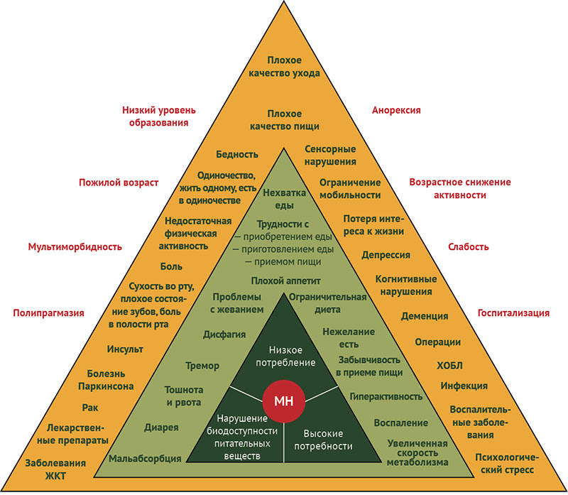 С использованием модифицированного процесса Дельфи международная группа экспертов разработала модель для теоретической основы этиологии мальнутриции «Детерминанты мальнутриции у пожилых людей» (determinants of malnutrition in aged persons, DoMAP) и, в частности, потенциальные причинные механизмы развития недостаточности питания [17]. Модельная конструкция состоит из трех треугольных уровней, иллюстрирующих предполагаемое направление причинности различных факторов риска развития недостаточности питания. Мальнутриция (МН) находится во внутреннем ядре модели, окруженном различными слоями факторов риска. Непосредственный слой состоит из трех основных условий, которые приводят к мальнутриции (низкое потребление, высокие потребности и нарушение биодоступности питательных веществ). Следующий слой состоит из факторов, которые напрямую вызывают одно из этих состояний, а самый внешний уровень представляет факторы, которые влияют на прямые факторы и косвенно вызывают одно из трех основных состояний. Представленная модель дает возможность лучше понимать этиологию мальнутриции, которую можно использовать как в научных исследованиях, так