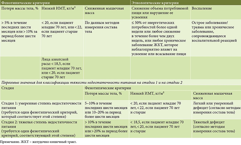 В таблице представлен проверенный инструмент скрининга, который дает объективную информацию для тщательной оценки и раннего выявления недостаточности питания на основании фенотипических и этиологических критериев.