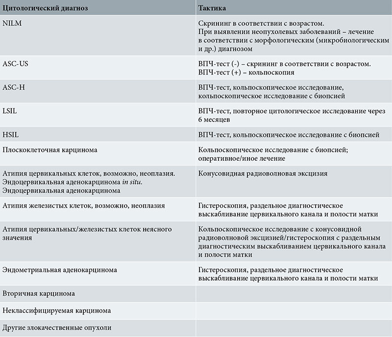 Срок от момента взятия материала до получения заключения не должен превышать 7–14 дней, кроме случаев, когда цитологическая лаборатория обслуживает учреждения отдаленных районов области (края, республики). В этом случае срок не превышает 30 дней. В зависимости от характера выявленной при скрининге патологии пациентки направляются для гинекологического, онкологического обследования и/или лечения в соответствующие территориальные медицинские учреждения (таблица). При несоответствии цитологических и гистологических заключений и/или результатов морфологических и молекулярных исследований необходимо коллегиальное обсуждение полученных данных для уточнения характера патологического процесса [5, 7].