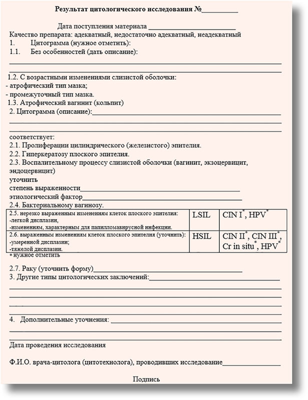 В соответствии с цитологической картиной эпителия, основанной на Bethesda и МКБ-10, на оборотной стороне стандартного бланка (форма № 446/у-02) формулируется заключение: