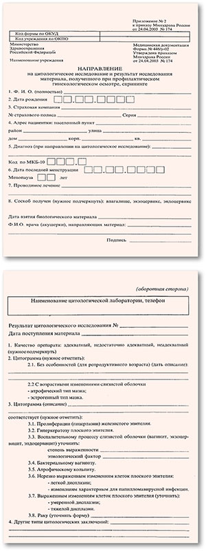 В нашей стране направлением на цитологическое исследование является стандартная форма № 446/у-02, утвержденная приказом Минздрава России от 24 апреля 2003 г. № 174 (рис. 1). Маркировки на стекле и бланке-направлении должны совпадать. Лицевую сторону учетной формы заполняет врач или акушерка, направляющие материал на цитологическое исследование. Заполняются все пункты лицевой стороны бланка. Оборотную сторону заполняет врач, проводивший цитологическое исследование.