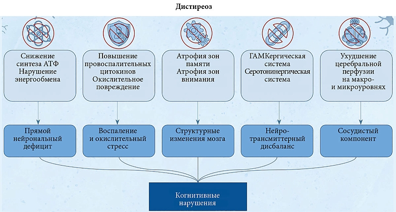 Проблема когнитивных нарушений (КН) является одной из самых чувствительных для современного здравоохранения в частности и общества в целом. Так, сосудистая деменция составляет от 20 до 40% всех видов деменции [40]. В пожилом возрасте КН чаще всего имеют полиэтиологическую природу. У пациентов с ЦВЗ дисфункция ЩЖ может быть потенциальной причиной ухудшения когнитивных способностей.
