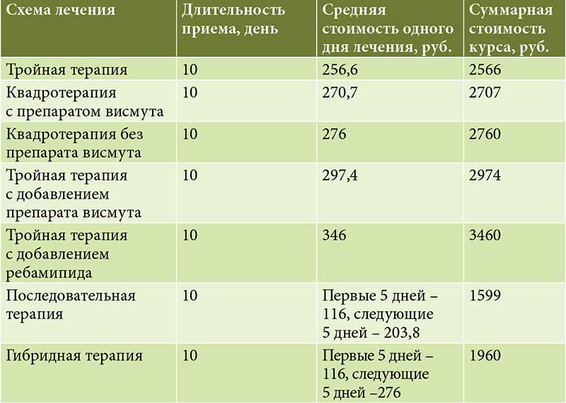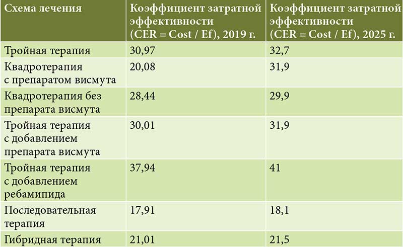 По результатам фармакоэкономического анализа, проведенного в 2019 г., наиболее выгодными с экономической точки зрения были последовательная терапия (CER = 17,91), квадротерапия с препаратом висмута (CER = 20,08) и гибридная терапия (CER = 21,01). Наиболее сбалансированными были признаны тройная терапия с добавлением препарата висмута (CER = 30,01) и квадротерапия без препарата висмута (CER = 28,44) [20].