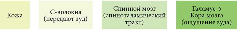 Первичные чувствительные нервные волокна, иннервирующие кожу, делятся на три группы в зависимости от степени миелинизации, диаметра и скорости проведения. Толстые миелинизированные волокна Aβ передают тактильные ощущения, тогда как тонко миелинизированные Aδ и немиелинизированные C-волокна в основном участвуют в передаче тепловых ощущений и ощущений боли (зуда) [24]. Зуд передается преимущественно немиелинизированными, медленно проводящими С-волокнами, которые тянутся к дермо-эпидермальному соединению, а их свободные окончания проникают в эпидермис, где и возникает ощущение зуда. Клеточные тела для этих волокон находятся в дорсальных корешковых ганглиях, сразу за спинным мозгом, поэтому зуд и боль связаны с вторичными передающими нейронами, которые поднимаются по контралатеральному спиноталамическому тракту в таламус. Отсюда и возникло предположение о том, что зуд является формой боли низкой интенсивности и передается теми же нейронами С-образного волокна [25, 26]. Эта теория больше не поддерживается, поскольку текущие исследования подтверждают другие концепции патогенетических моделей зуда [27].