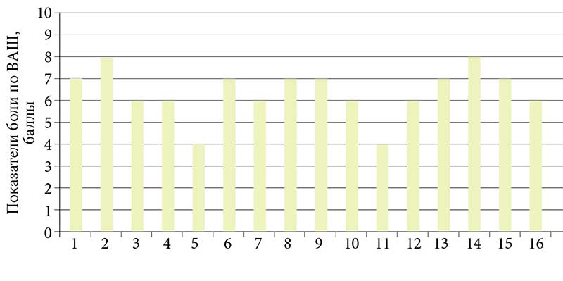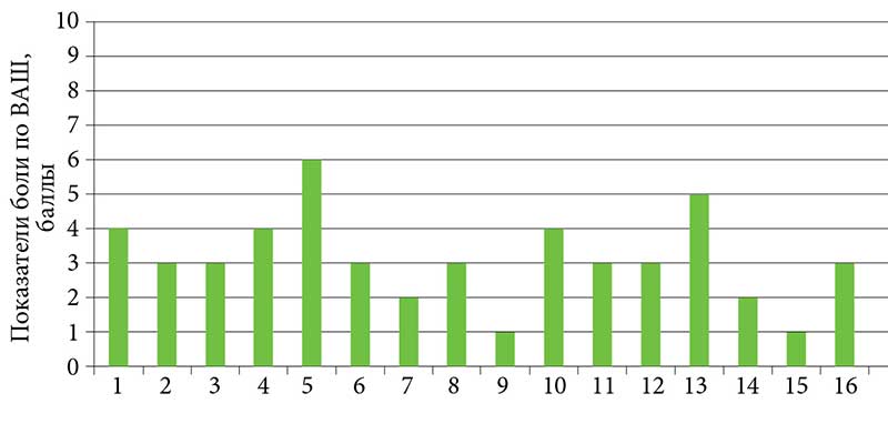 Интенсивность боли фиксировали во время выполнения вмешательства с использованием ВАШ, где 0 баллов соответствовало отсутствию боли, а 10 баллов – максимально возможной боли.
