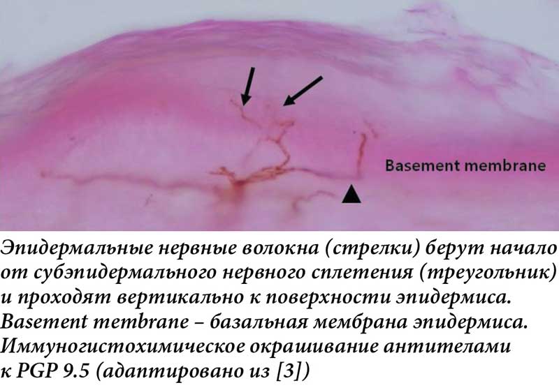 За болевую чувствительность кожи отвечают преимущественно свободные нервные окончания первичных афферентных нейронов. Сигнал проводится по двум типам волокон: Aδ-волокна (А-дельта) – тонкие миелинизированные, характеризуются способностью быстро проводить импульс, что ассоциируется с колющей болью; С-волокна – немиелинизированные, медленные, отвечают за жгучую и ноющую боль и зудоподобные ощущения. Окончания двух типов волокон, согласно современным литературным данным, располагаются в глубоких слоях эпидермиса (базальном и шиповатом) и сосочковом слое дермы [1, 2]. На уровне молекулярной трансдукции ноцицептивные стимулы активируют ионные каналы на окончаниях (в т.ч. семейство Transient Receptor Potential, TRP), что вызывает деполяризацию и генерацию потенциалов действия, при этом частота импульса коррелирует с интенсивностью стимула, что и воспринимается как боль [2]. Большинство манипуляций в области периунгвальной зоны вызывает стимуляцию именно этих свободных окончаний, поэтому клиническая задача аппликационной анестезии – довести эффективную концентрацию анестетика до уровня, где расположены Aδ- и С-волокна (рис. 1) [3].
