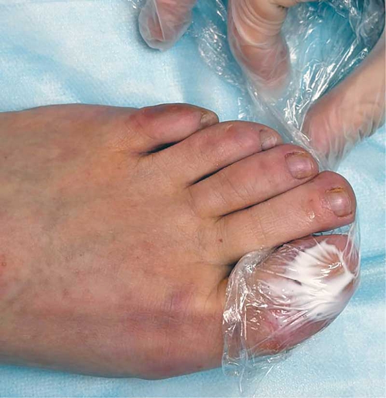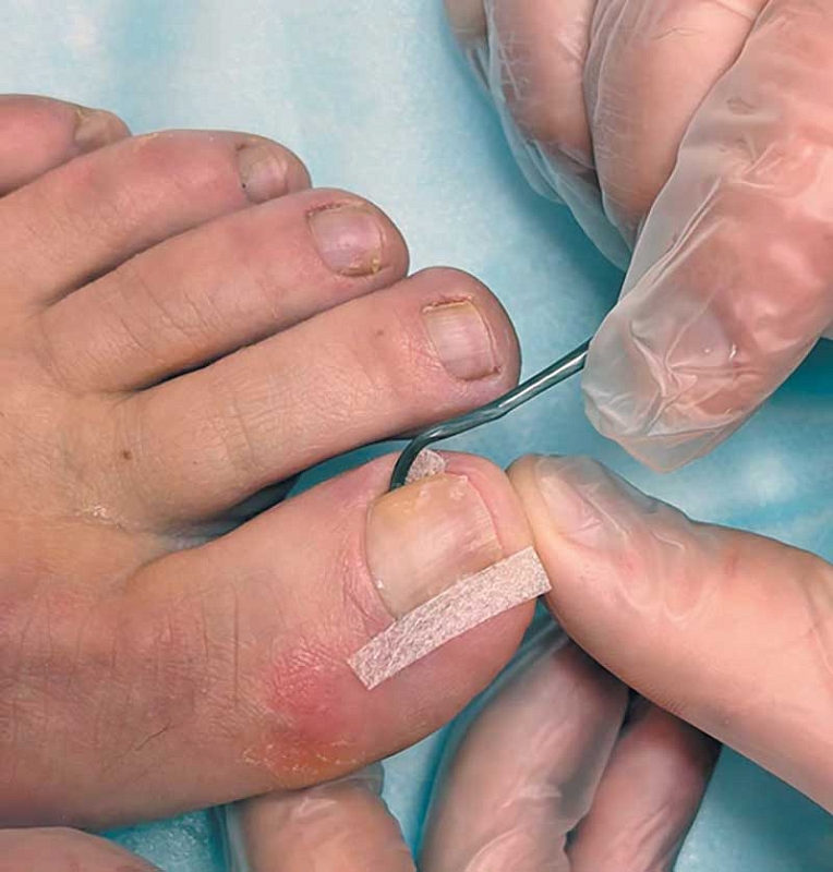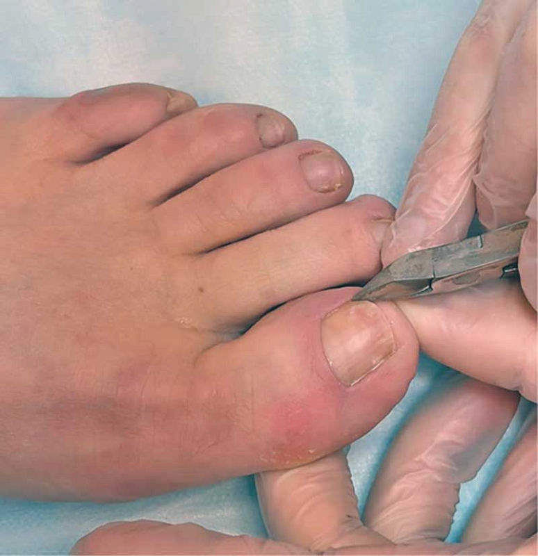 Пациентам из обеих групп проводили резекцию вросшего сегмента ногтевой пластины с помощью профессионального подологического оборудования и материалов: кюрета, щипцы для коррекции вросшего ногтя, перевязочный материал, антисептики. Протокол манипуляции представлен на рис. 2–5.