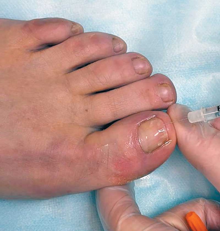Цель – оценить влияние оптимизированного протокола аппликационной анестезии (предварительная аппликация 25%-ного раствора диметилсульфоксида в течение 10 минут с последующим нанесением крема ЭМЛА под окклюзию на 60 минут) на выраженность болевого синдрома по ВАШ при малоинвазивном подологическом удалении вросшего ногтя по сравнению с выполнением аналогичного вмешательства без анестезии.