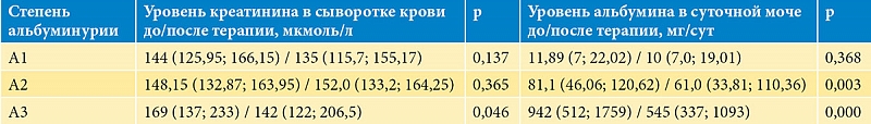 При разделении пациентов в зависимости от степени альбуминурии статистически значимым оказалось снижение альбуминурии в группах с умеренно повышенной и высокой альбуминурией, при этом в группе с наиболее выраженной альбуминурией статистически значимо снизилась концентрация креатинина сыворотки крови (табл. 5).