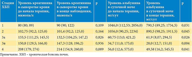 При анализе биохимических показателей крови и мочи пациентов в зависимости от стадии ХБП снижение альбуминурии было отмечено во всех группах, в отличие от уровня креатинина в сыворотке крови, который значимо не изменился (табл. 4).