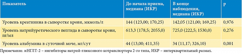 При анализе всей когорты было продемонстрировано значимое снижение суточной альбуминурии при отсутствии значимых различий концентрации креатинина и натрийуретического пептида сыворотки крови (табл. 1).