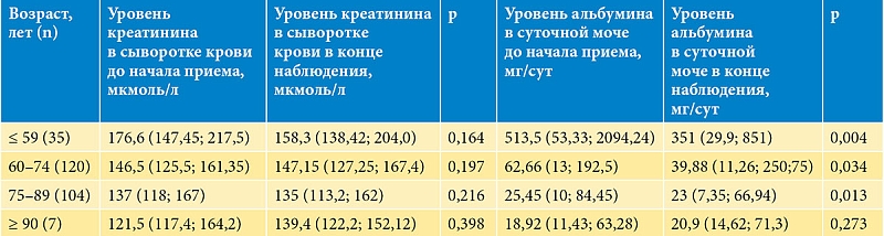 При анализе возрастных подгрупп статистически значимое снижение альбуминурии было отмечено во всех группах, кроме группы пациентов 90 лет и старше. Концентрация креатинина сыворотки крови не отличалась в указанных подгруппах (табл. 2).