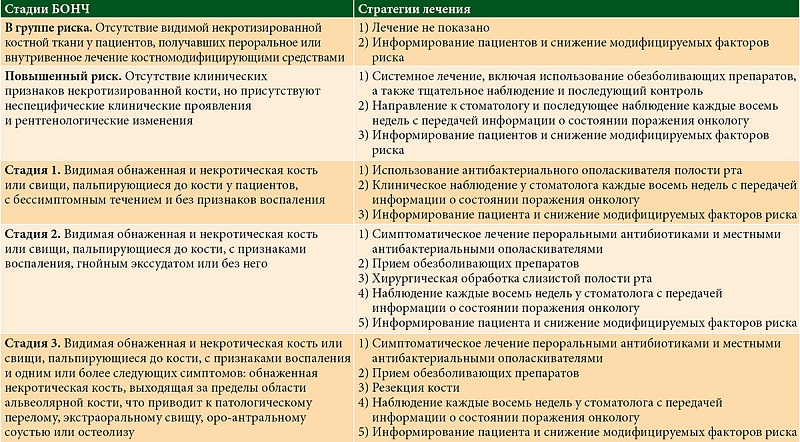 В программном документе Американской ассоциации челюстно-лицевых хирургов 2014 г. представлена пересмотренная система клинического стадирования для описания тяжести БОНЧ. Различные стадии и предлагаемые стратегии лечения описаны в таблице. В рекомендациях 2019 г. Многонациональной ассоциации поддерживающей терапии при раке (MASCC)/Международного общества оральной онкологии (ISOO)/Американского общества клинической онкологии (ASCO) предлагается рассматривать стадию 0 как показатель повышенного риска БОНЧ, что может послужить поводом для направления к специалисту-стоматологу для тщательного наблюдения [26].