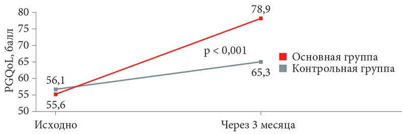 Согласно результатам опросника PGQoL, через шесть месяцев терапии в основной группе наблюдалось статистически значимое улучшение показателей качества жизни по сравнению с исходным уровнем (увеличение общего балла с 55,6 ± 8,2 до 78,9 ± 10,1; p < 0,001). В контрольной группе улучшение было менее выраженным (увеличение общего балла с 56,1 ± 7,9 до 65,3 ± 9,5; p < 0,05). При сравнении между группами показатели качества жизни были статистически значимо выше в основной группе (p < 0,01) (рис. 3).