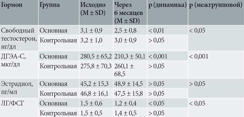 В основной группе зафиксировано достоверное снижение уровней свободного тестостерона – с 3,1 ± 0,9 до 2,5 ± 0,8 нг/дл (p < 0,01) и ДГЭА-С – с 280,5 ± 65,2 до 210,3 ± 50,1 мкг/дл (p < 0,001), а также нормализация ЛГ/ФСГ – с 1,5 ± 0,6 до 1,2 ± 0,4 (p < 0,05). В контрольной группе существенных изменений в отношении указанных гормональных параметров не зарегистрировано (p > 0,05). Уровень эстрадиола в обеих группах показал незначительную динамику (p > 0,05). Между группами не выявлено статистически значимых различий в изменении уровней эстрадиола (p > 0,05). Таким образом, терапия ЕВРА продемонстрировала эффективность в коррекции гиперандрогении и нормализации функционирования гипоталамо-гипофизарно-яичниковой оси, в то время как циклическая витаминотерапия не оказала статистически значимого влияния на гормональный статус пациенток.