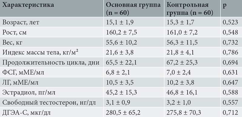 Демографические и исходные клинические характеристики пациенток обеих групп были сопоставимы, что подтверждает эффективность рандомизации (табл. 1). Средняя продолжительность менструального цикла до начала исследования в основной группе (ЕВРА) составила 65,5 ± 22,1 дня, в контрольной (циклическая витаминотерапия) – 67,2 ± 25,3 дня (p > 0,05). Уровни ФСГ, ЛГ, эстрадиола, свободного тестостерона и ДГЭА-С также не имели статистически значимых различий между группами до начала терапии.