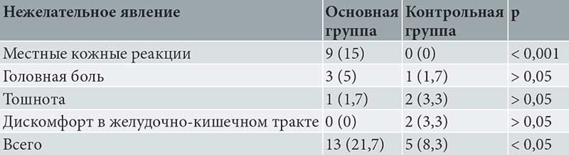 В контрольной группе НЯ, связанные с приемом витаминных комплексов, отмечались редко и имели легкую степень. В частности, дискомфорт в желудочно-кишечном тракте отмечался у 2 (3,3%) пациенток (табл. 3).