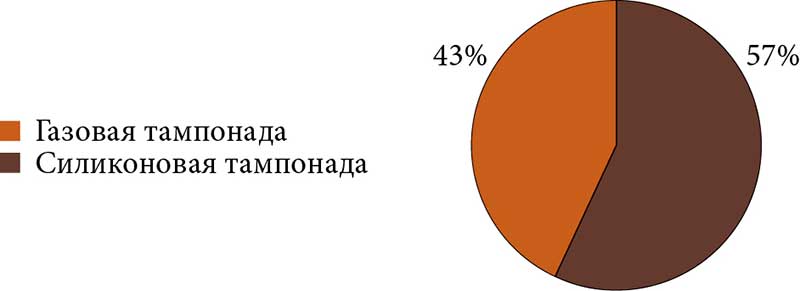 При выборе газовой тампонады в период наблюдений чаще применяли газ С3F8 – 57% случаев. К сожалению, в современном мире экономический фактор (наличие того или иного тампонирующего средства) также имеет большое значение при выборе тактики лечения.