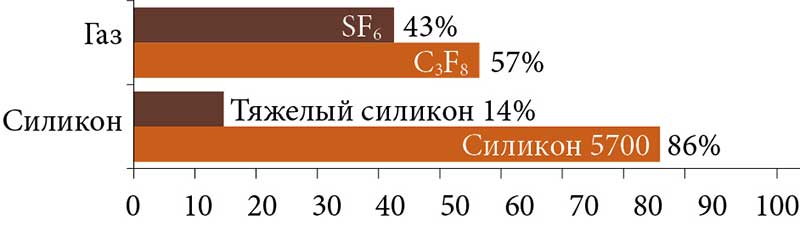 Как показано на рис. 2, в клинической практике офтальмологического отделения МОНИКИ в качестве тампонирующего средства силиконовое масло 5700 использовали в 86% случаев, тяжелый силикон – в 14% случаев.