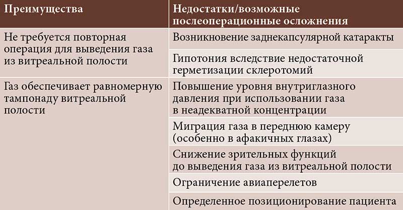 По данным A. Kontos и соавт., продолжительность газовой тампонады в глазу составляет 13–24 дня для SF6, 28–44 дня для C2F6 и 59–79 дней для C3F8 [3]. Преимущества и недостатки газовоздушной тампонады витреальной полости перечислены в таблице.