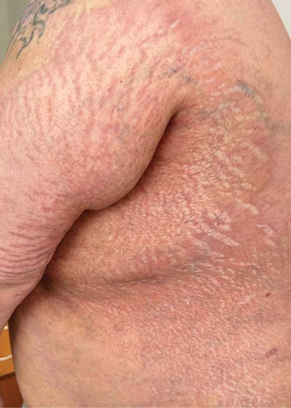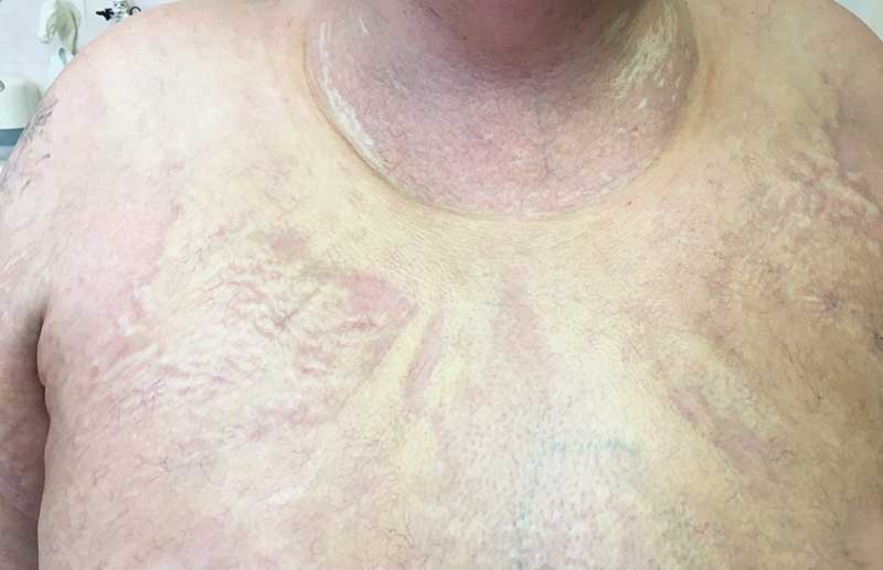 Из анамнеза заболевания известно, что заболевание началось в 2012 г. после дорожно-транспортного происшествия (ДТП), в результате которого мужчина получил множественные открытые переломы правой ноги и лицевого отдела черепа, рваные раны лица, конечностей. По данному поводу было проведено хирургическое лечение методом остеосинтеза. Через месяц стал отмечать появление высыпаний в области грудной клетки, верхних и нижних конечностей, которые сопровождались чувством стягивания. С данными жалобами пациент был направлен к дерматовенерологу в поликлинику по месту жительства, где ему был выставлен впервые диагноз склеродермии. С течением времени площадь поражения увеличивалась, затрагивая новые анатомические зоны.