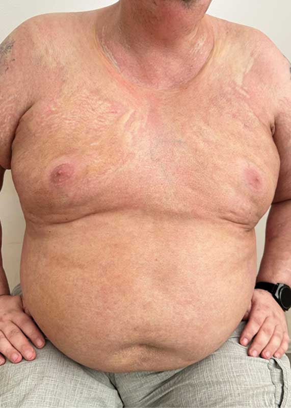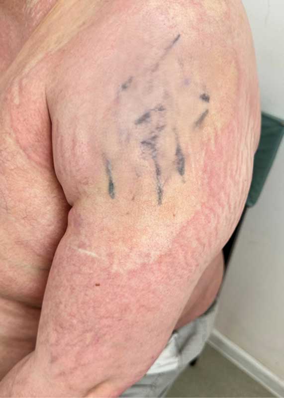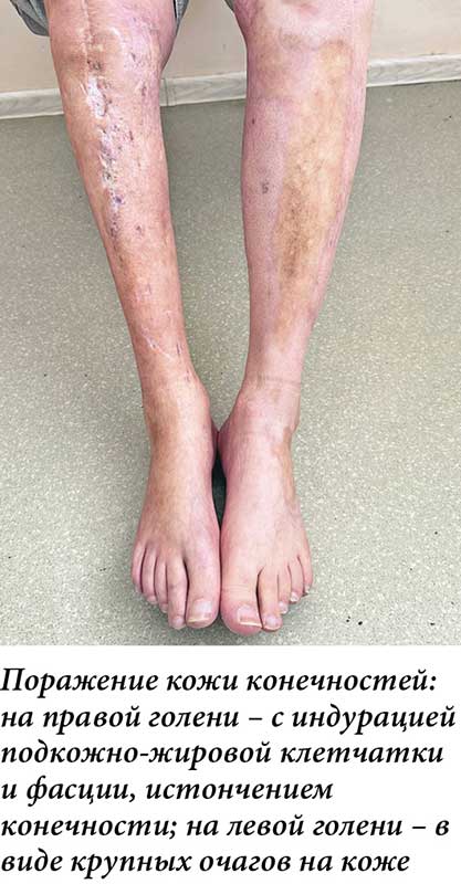 В феврале 2025 г. в Областной кожно-венерологический диспансер г. Ярославля поступил пациент С., 37 лет, с жалобами на обширные высыпания в области туловища и конечностей, чувство стягивания кожи, ограничение подвижности суставов, боль в области суставов правой нижней конечности.