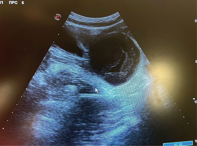 При пальпации в области живота – болезненность над лоном слева и опухолевидное образование. Данные ультразвукового исследования (УЗИ): образование в проекции левого яичника размером 4,7 × 3,8 × 4,8 см с неоднородной структурой и четкими контурами, старый перекрут левых придатков матки (рис. 1). Выявлено также небольшое количество свободной жидкости в полости малого таза (0,8 см). Заключение: эхопризнаки образования левого яичника, предположительно кисты желтого тела.