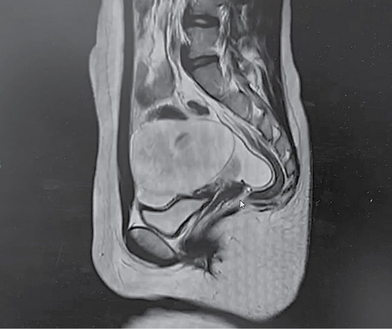 В сентябре по результатам МРТ ОМТ зафиксировано в позадиматочном пространстве слева образование неправильной формы размером 92 × 70 × 61 мм с нечеткой визуализацией ткани яичника (рис. 2). Кроме того, обнаружена свободная жидкость в полости таза. Заключение МРТ: геморрагическая киста слева.